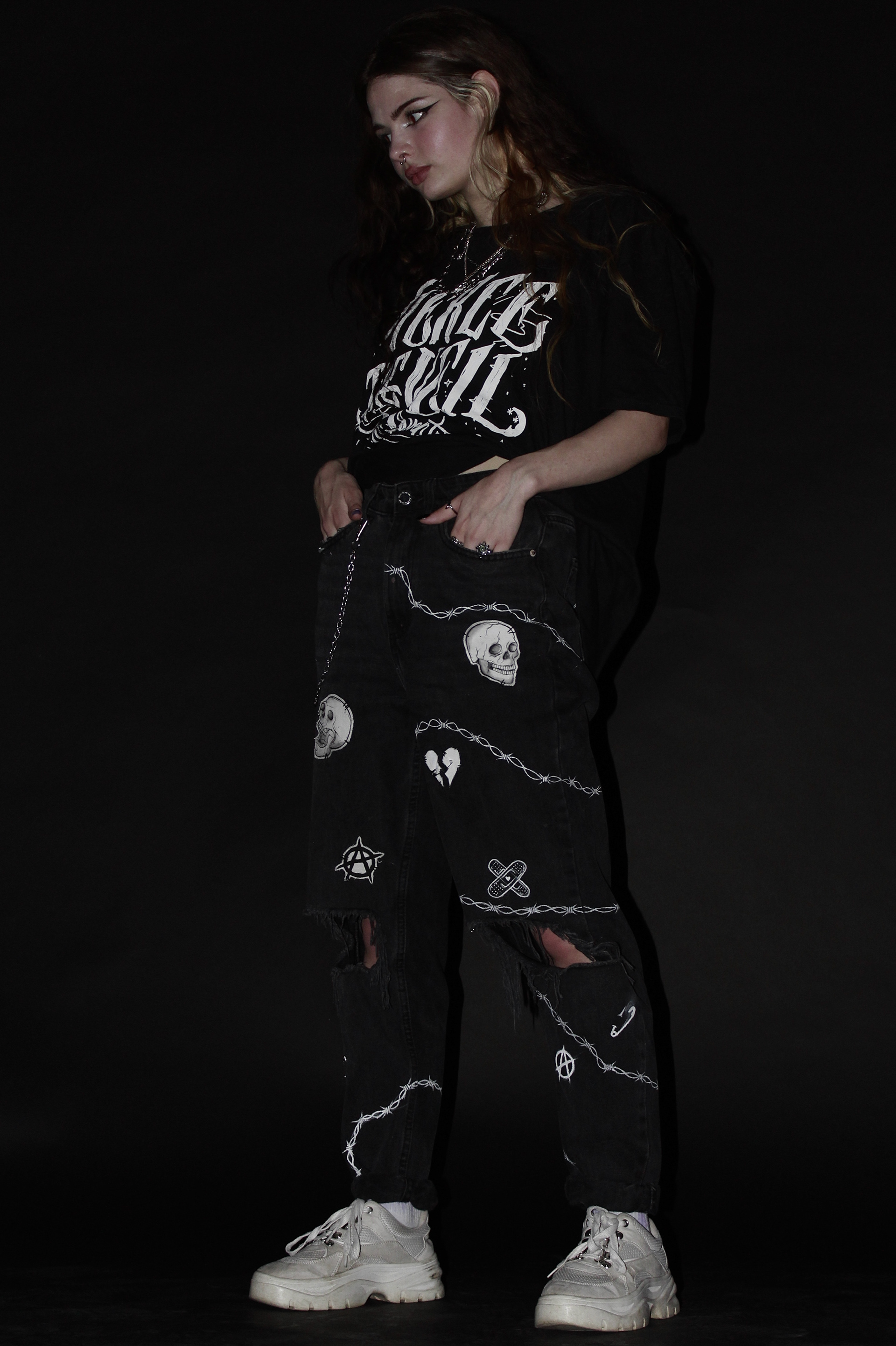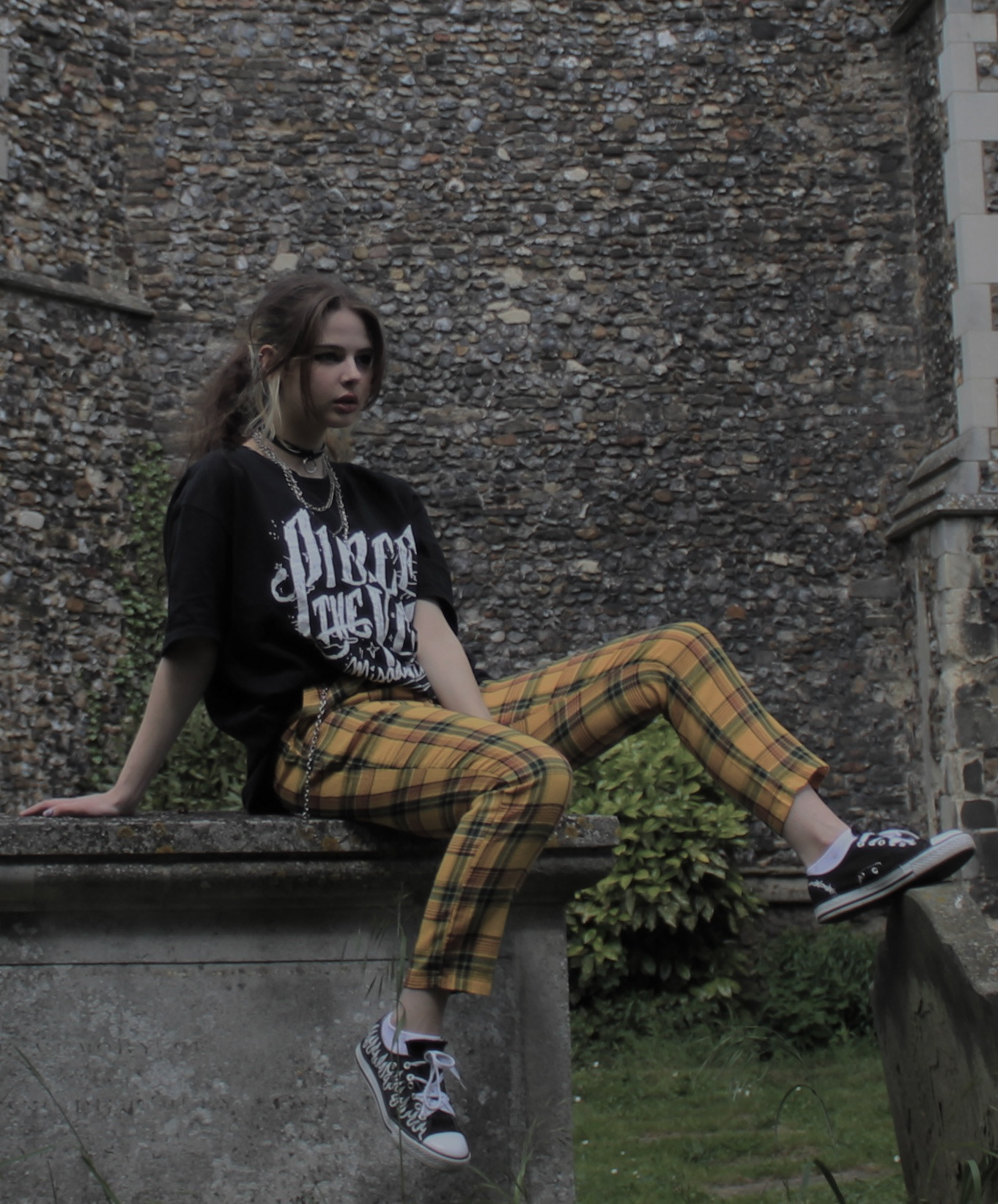 My work consists of a collection of punk based work. Carefully constructed to make an album cover. I have researched many ways to create successful punk attire. As fashion is a large part of punk culture, I explored different ways to successfully produce a jacket and crust pants. A lot of time was spent sewing with dental floss and a curved sewing needle to provide more strength compared to threads. Many hours were spent layering white acrylic paint to make the patches on the jacket and crust pants more definalbe. I prepared models for my photoshoot to have band type photos for the photobooth style photo stripes for the album cover I have produced. The album cover was a development design idea inspired by the Cramps album cover.