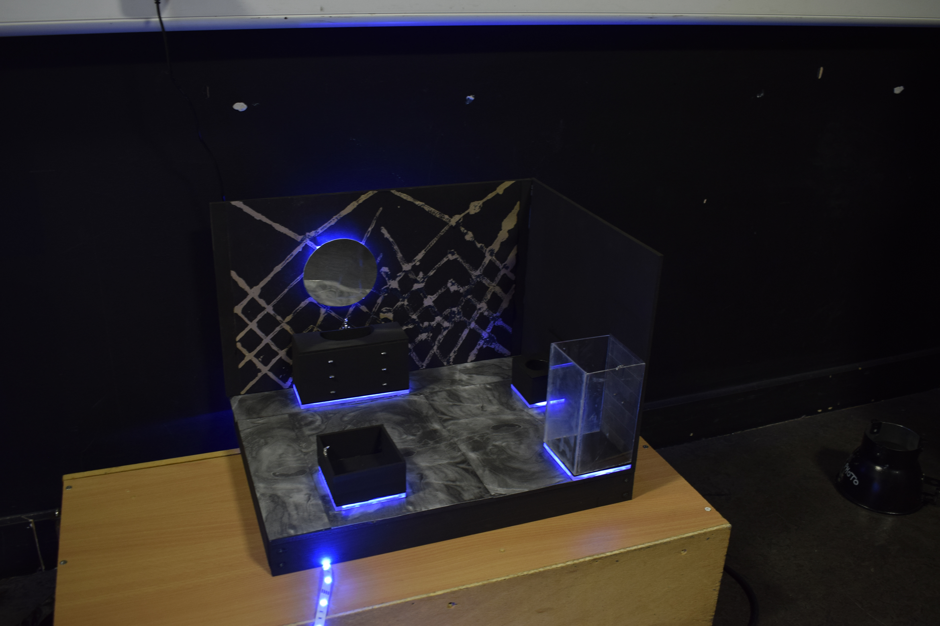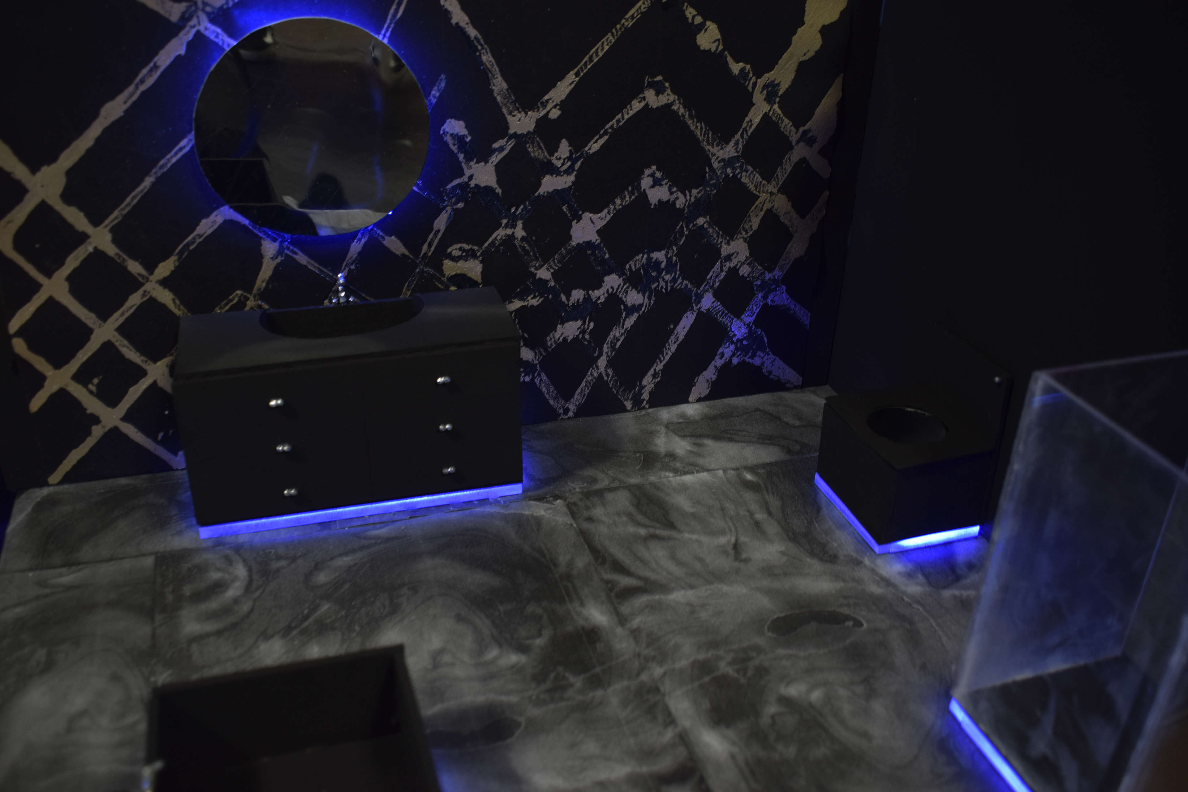 I have exhibited a maquette of a bathroom. As my theme is interior design I thought making a maquete would be the best way to represent the ideas I had of a modern, high end bathroom. I have designed all the furniture, chosen a layout and created wallpaper and flooring. The wallpaper was created by foiling and the floor by marbling. LED lighting is used to accentuate the furniture in the bathroom.